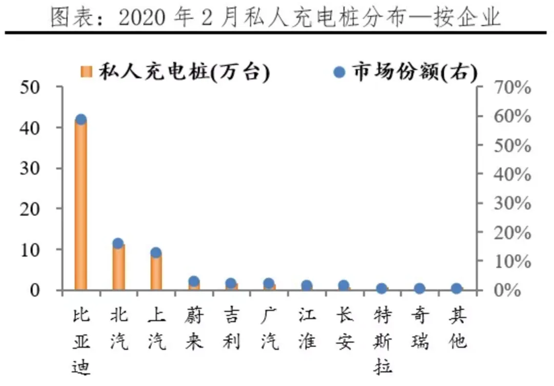 私人充电桩一般随新能源汽车附送或购买,因而份额基本都是车企。我国又以比亚迪独大,一骑绝尘,截至2020年2月,比亚迪运营的私人充电桩41.9万台,市场份额接近6成,北汽、上汽分列第二第三,分别是占比15.9%、13.1%。