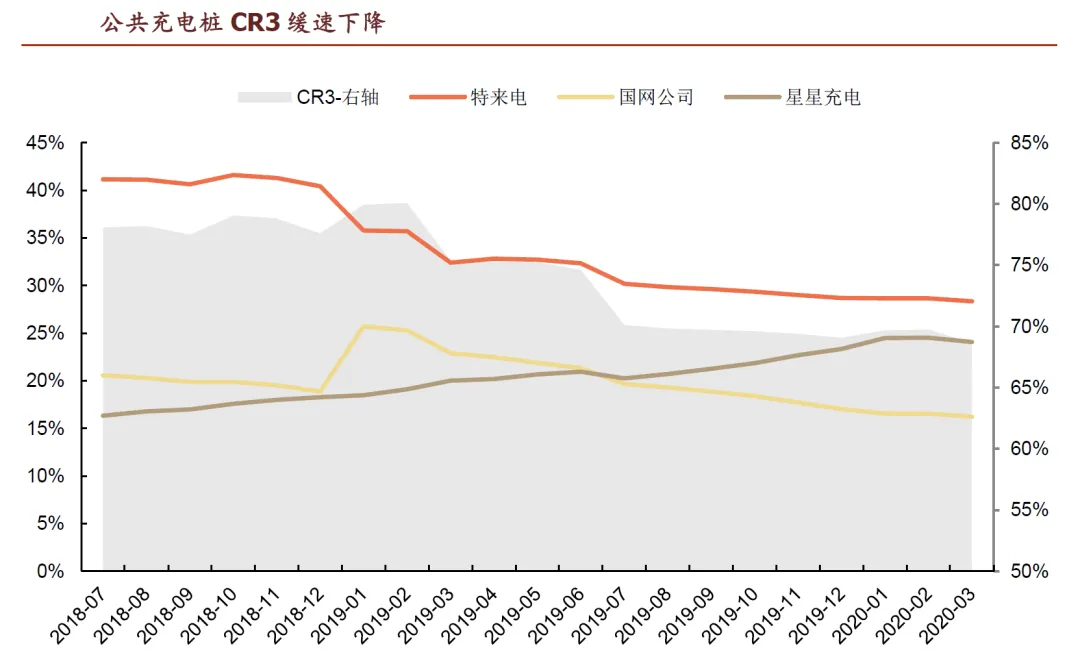竞争上,充电桩行业集中度较高,龙头企业引领大方向,但是近几年特来电、星星充电和国家电网三龙头市占率小幅下行,一方面是公司不再盲目投建,放慢了速度,一方面也是因为更具竞争力的新玩家的加入。