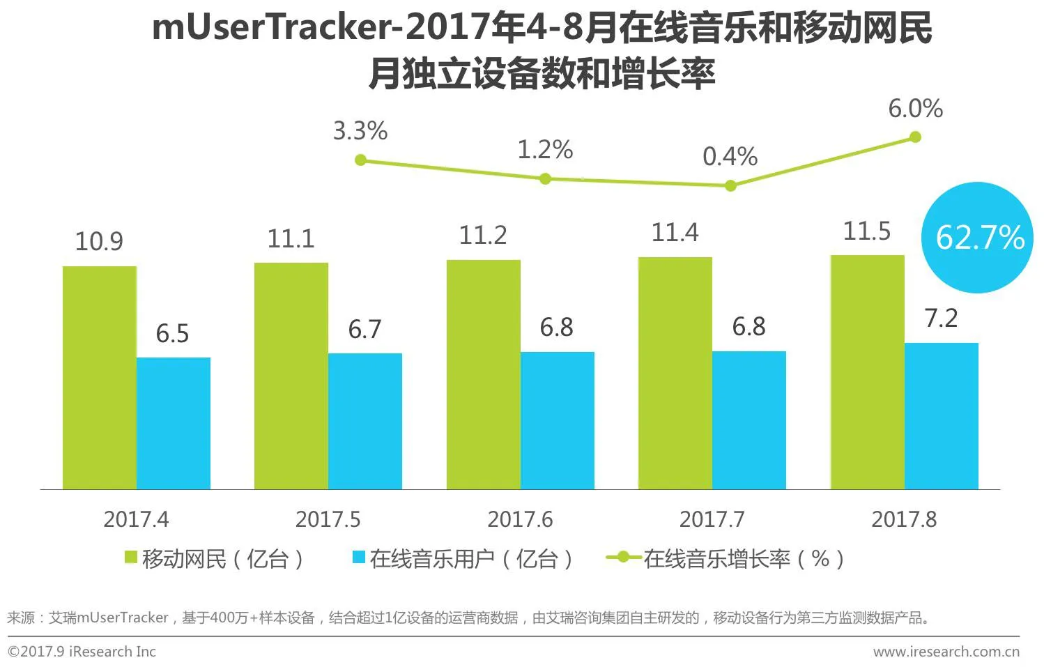 1、2017年移动在线音乐仍在小幅平稳增长,2017年8月在线音乐月活用户已占到移动端用户的62.7%;
