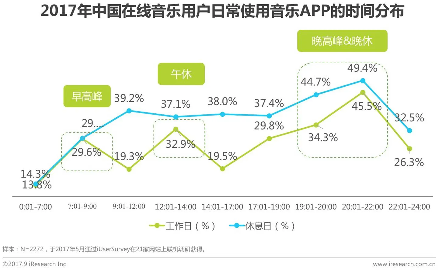 在工作日,用户在午休、上下班和晚间在家休息时间段听音乐,且在晚间达到高峰;在休息日,用户听音乐的时间段比较分散,但整体高于工作日