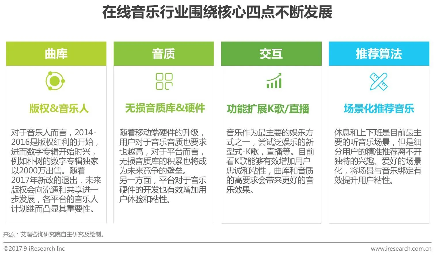 曲库、音质、交互和推荐算法是在线音乐的核心