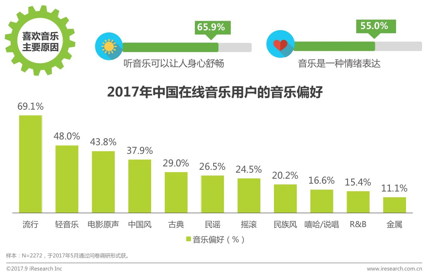 排名第二的是轻音乐,减压放松是用户听音乐的主要驱动力