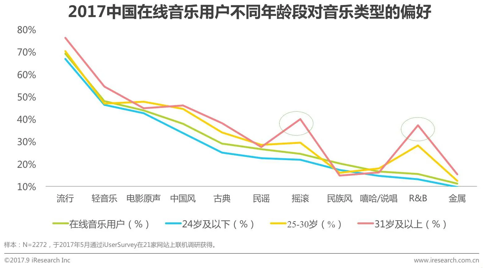 30岁以上用户音乐偏好两级分化-轻松的R&B和激情的摇滚