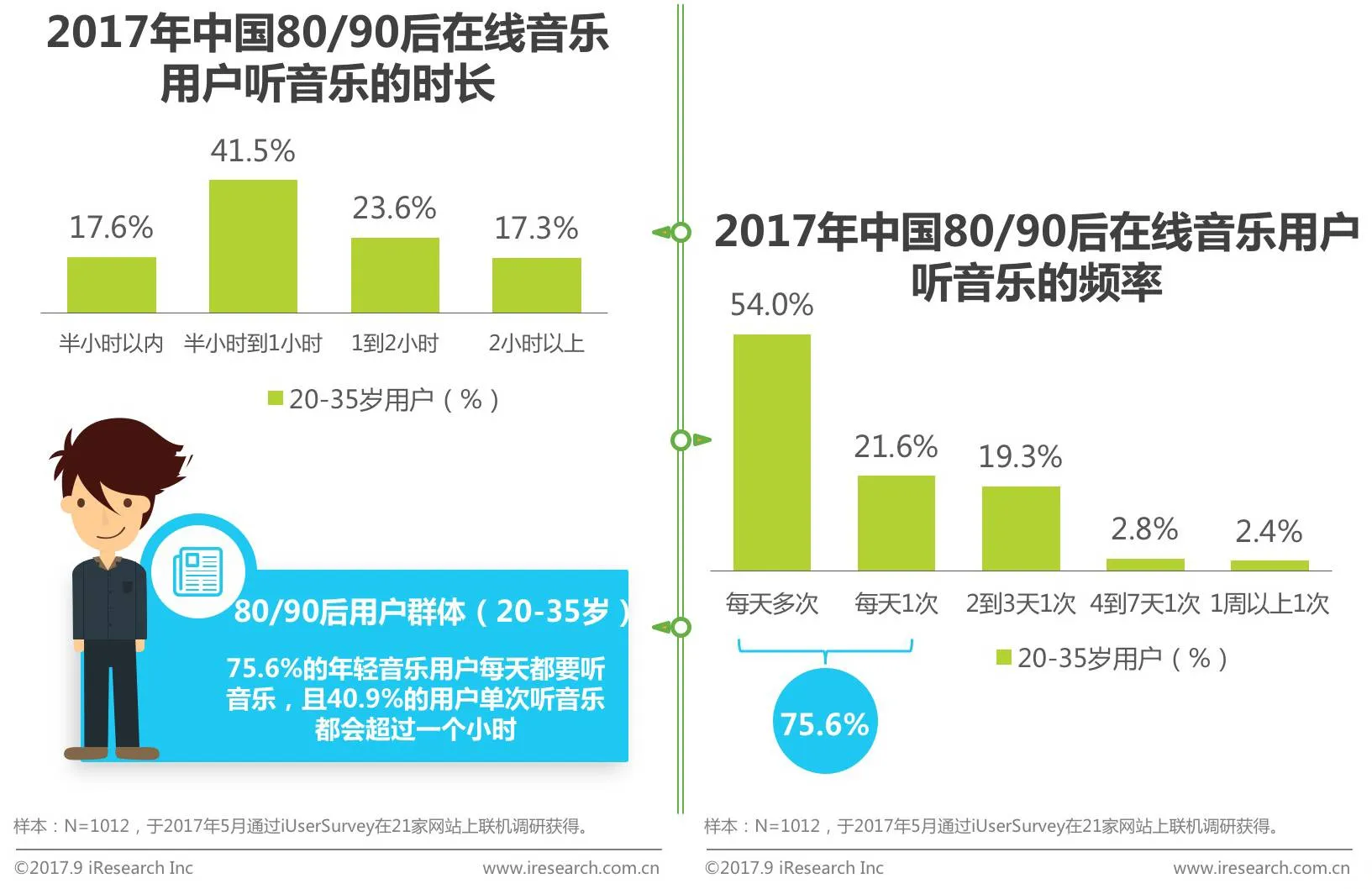 3、75.6%的80/90后音乐用户每天都要听音乐,且40.9%的用户单次听音乐都会超过一个小时。