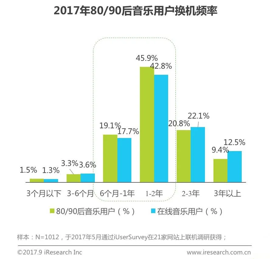 80/90后音乐用户的苹果手机持有率为28%,而整体在线音乐用户的苹果手机持有率为20.6%;用户多在1-2年换手机,相对而言, 80/90后音乐用户更加追求品质生活,换机频率更高。