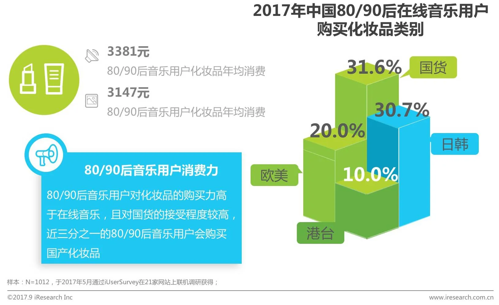 80/90后音乐用户的年均消费比整体在线音乐用户高,且对国货化妆品的接受程度最高,其次是日韩化妆品