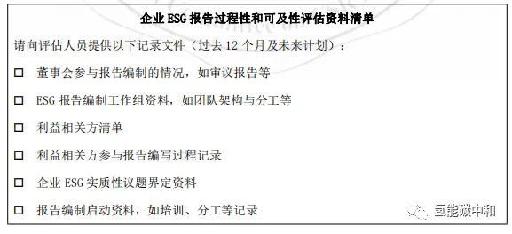 企业自填秘书处发送的“企业 ESG 报告过程性和可及性评估资料确认书”(见附录三)或秘书处通过与企业报告编制负责人在线访谈了解企业编制过程,评估企业 ESG 报告编制的规范性,记录覆盖《企业 ESG 报告过程性和可及性评估资料清单》(以下称“过程性和可及性评估清单”)中过程性指标的比例。