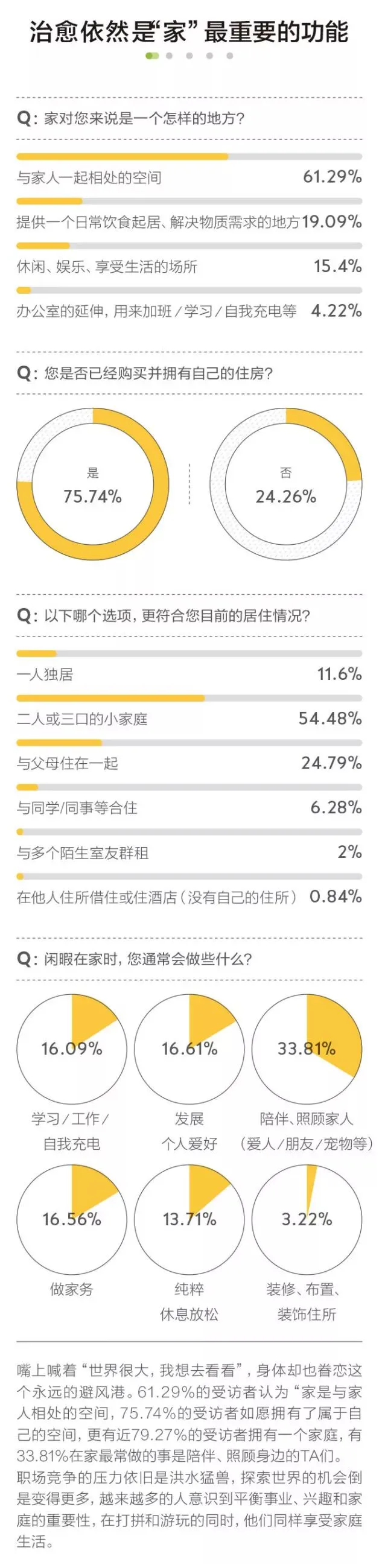 在《第一财经周刊》发起的“软装生活报告”调查中,认为“家”是“与家人一起相处的空间”选项的比例达到61%,远超认同“解决物质需求的地方”的比例。