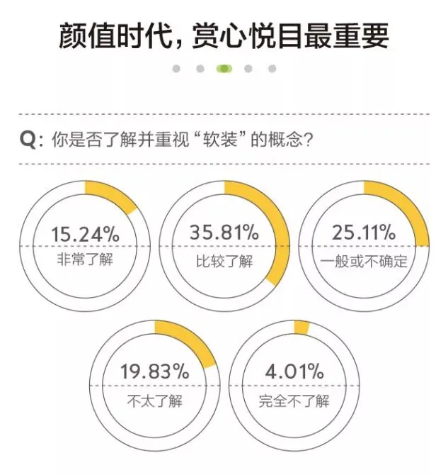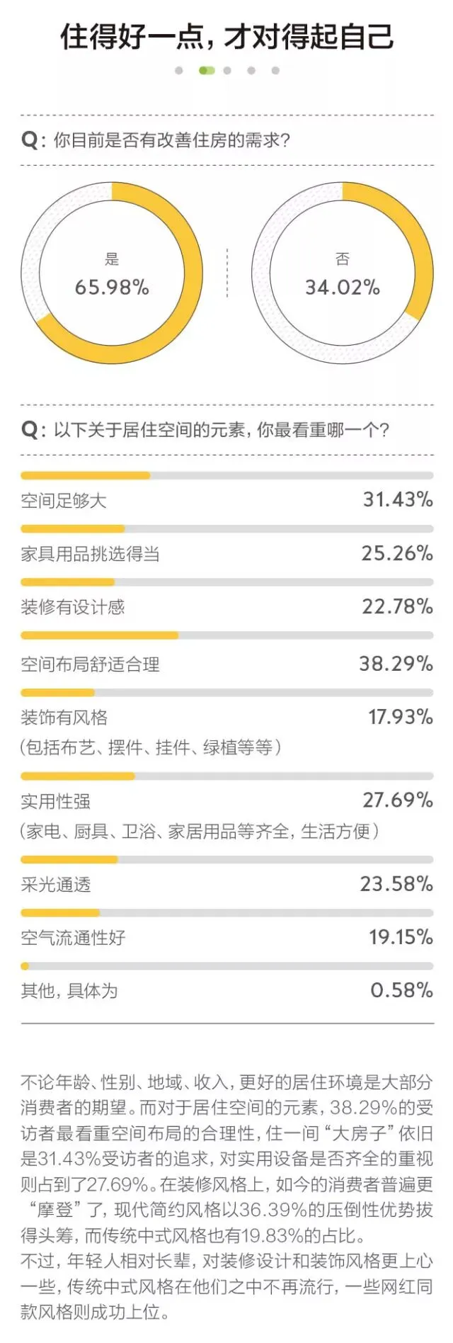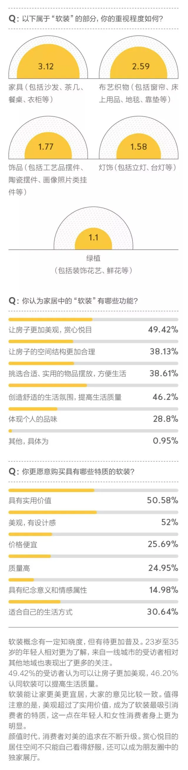 在调查中,软装的“美观、有设计感”超过“实用价值”,成为吸引消费者购买的最重要因素。在我们的调查中,有49%的受访者同意“软装最重要的功能是让房子更加美观和赏心悦目”,并且有52%的受访者表示愿意购买“具有美感和设计感的软装物品。”