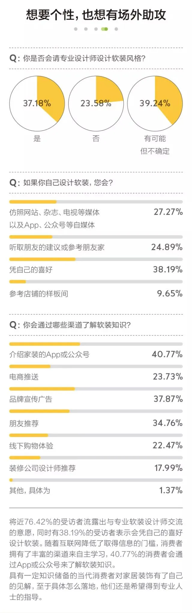 高达76%的消费者在调查中流露想请专业设计师来设计软装风格的意愿,然而市场上一般的家装公司却并不能满足如今的需求,类似美克美家这样由品牌衍生的软装设计服务,也只是少数。