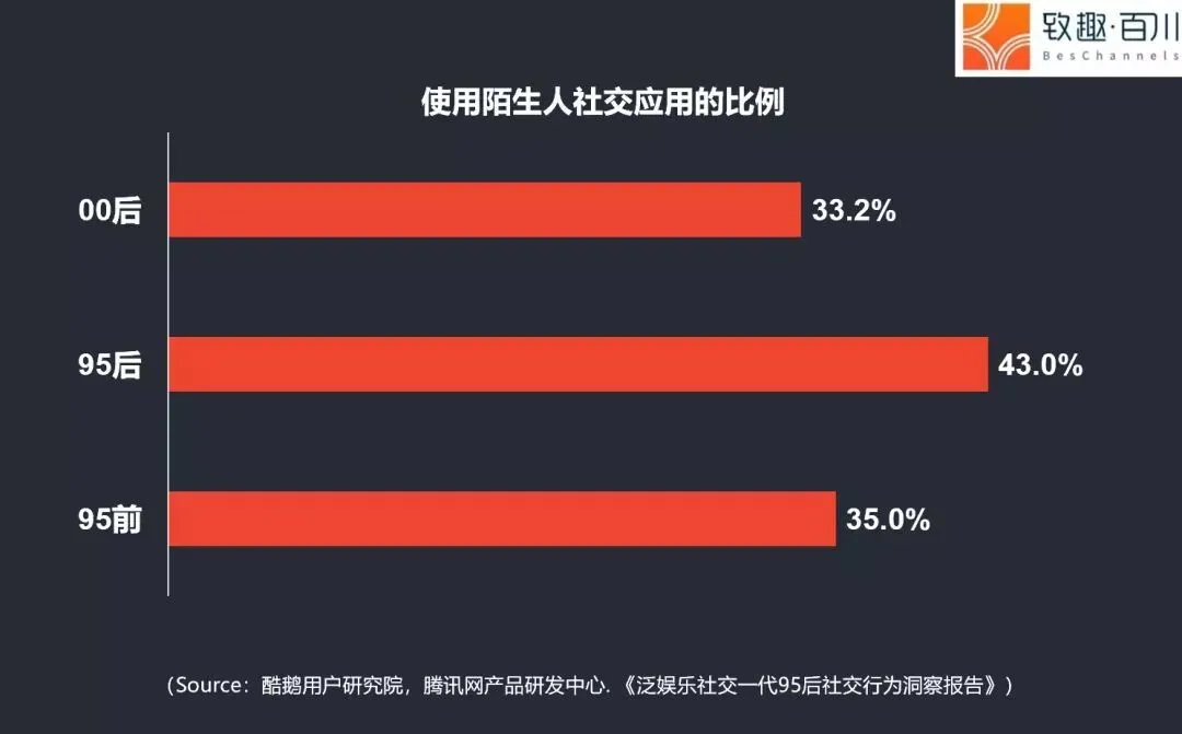 43.0%的95后使用陌生人社交应用,高于95前(35.0%)和00后(33.2%)。