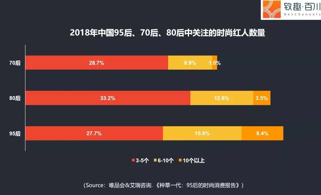 在Z世代的群体中,并不存在单一的趋势制定者。时尚资讯方面,51.9%的95后关注了3个以上的时尚达人,15.8%的95后关注6-10个网络红人,8.4%的95后会关注10个以上的时尚红人。