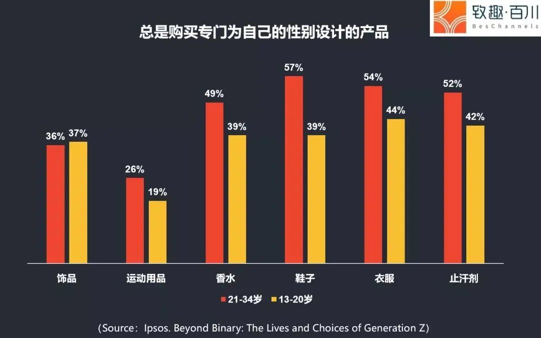 “去性别化”的观念不仅体现在他们的产品购买,还体现在他们的性取向或性别。仅66%的Z世代认为自己是完全的异性恋,而千禧一代的这一比例为71%,X一代的这一比例为85%。