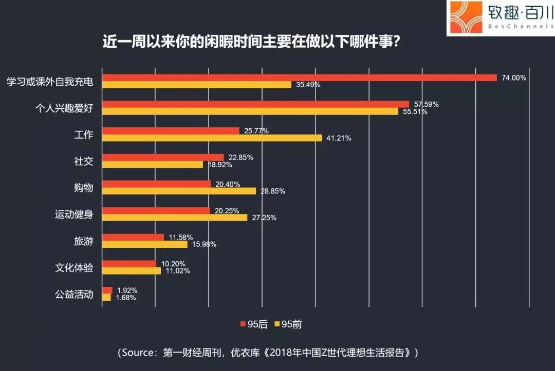 10 74%的95后将闲暇时间用来学习充电,而仅有35.49%的95前这样做。但仅有18%的95后表示会占用自己的周末来学习和工作。