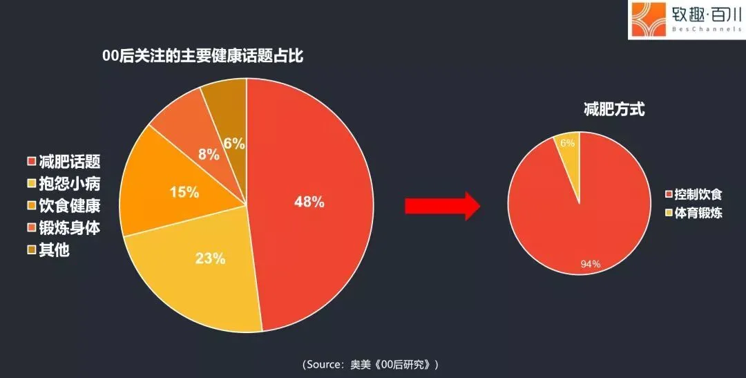 11 48%的00后会在微博上讨论减肥的话题(锻炼身体为8%)。其中94%的00后表示会用控制饮食的方式来减肥,仅有6%会提及体育锻炼。