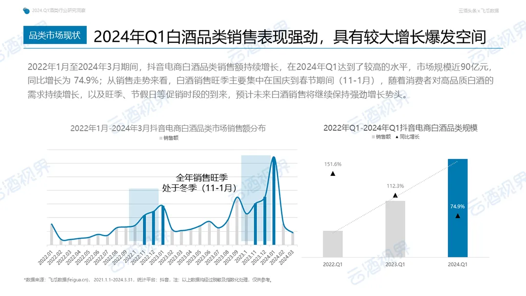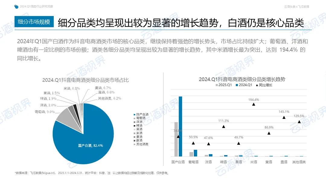 这当中,白酒仍然是抖音酒类电商的核心品类,保持着强劲势头,在2024年Q1达到较高水平,市场规模近90亿元,同比增长74.9%。