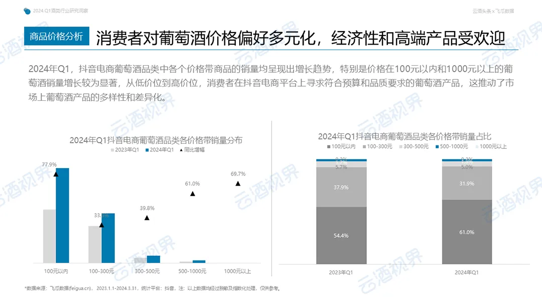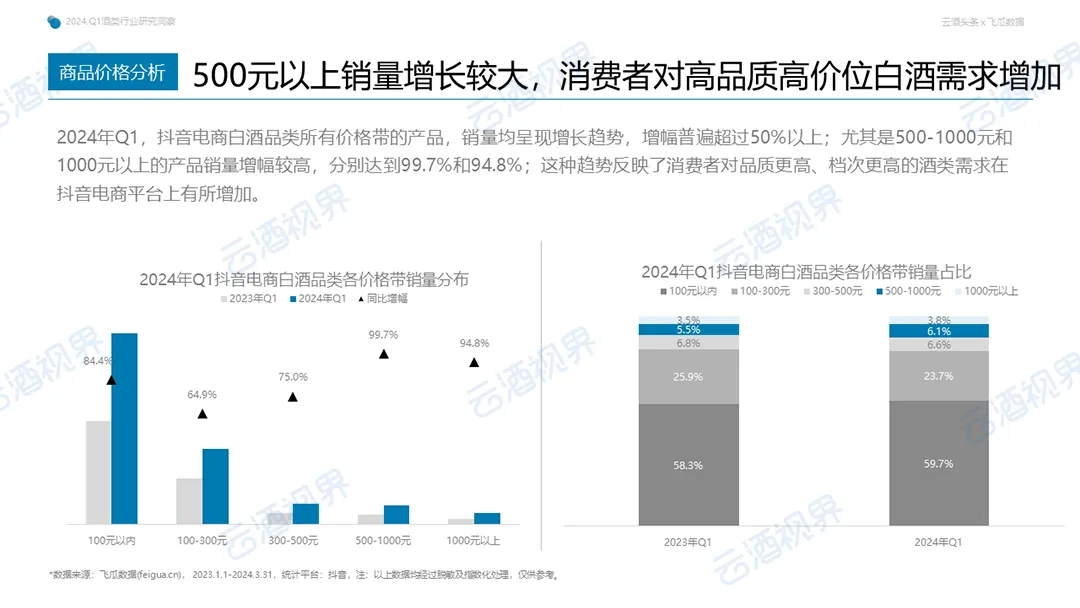 其中,约73%的品牌同比增长呈正向增长,约60%的品牌增长幅度超过100%。高价白酒在抖音平台更是保持了高位增长,一季度500-1000元和 1000元以上的白酒产品销量增幅较高,分别达到99.7%和94.8%。