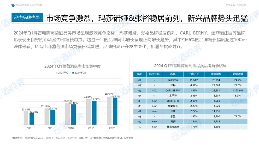 并且,抖音酒类电商的品牌竞争正在变得越来越多元化,市场集中度较以往有所下降,CR3仅有30.72%,CR20仅有50.60%,新兴品牌在抖音电商中的崛起,正在创造新的市场竞争格局。