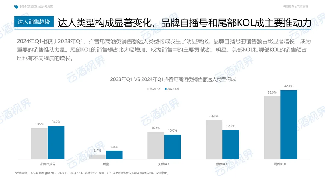 报告显示,抖音酒类电商今年一季度品牌自播号的销售额占比显著增长,成为重要的销售推动力量。尾部KOL的销售额占比大幅增加,成为销售中的主要贡献者。明星、头部KOL和腰部KOL的销售额占比也有不同程度的增长。