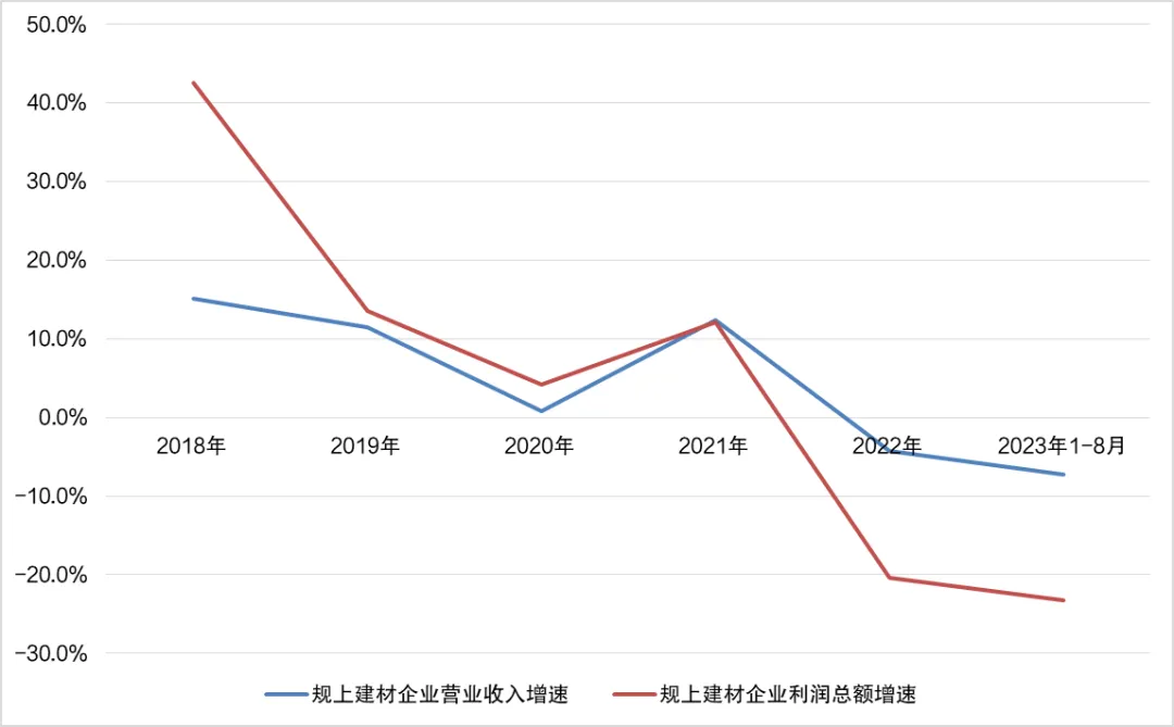 图1:2018年-2023年8月中国建材行业营业收入及利润总额增速