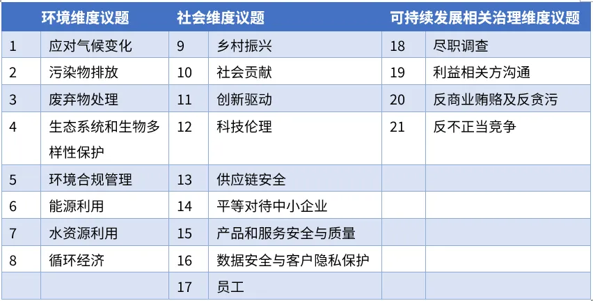 议题索引表从环境、社会和可持续发展相关治理三个维度分别列示了该维度下议题,包括应对气候变化等8项环境维度议题、乡村振兴等9项社会维度议题和尽职调查等4项可持续发展相关治理维度议题,合计21项。索引表还将这些议题与《指引》条款做了一一对照,方便使用。