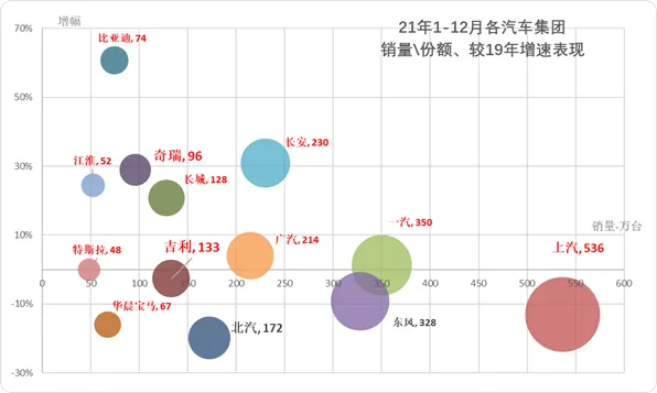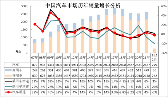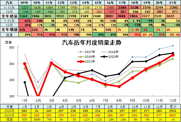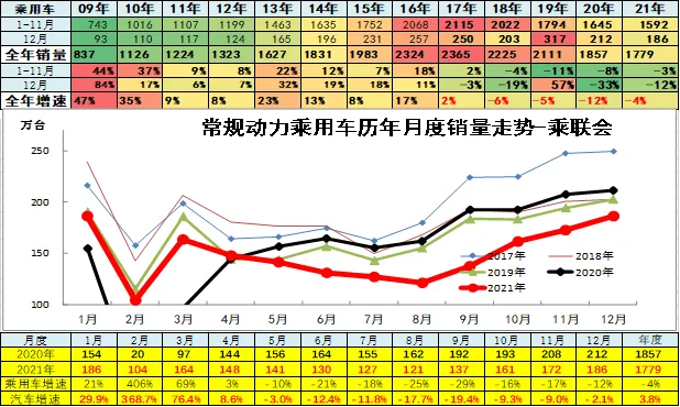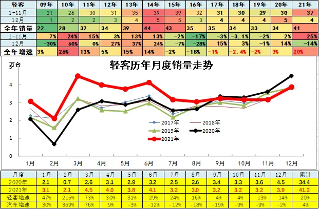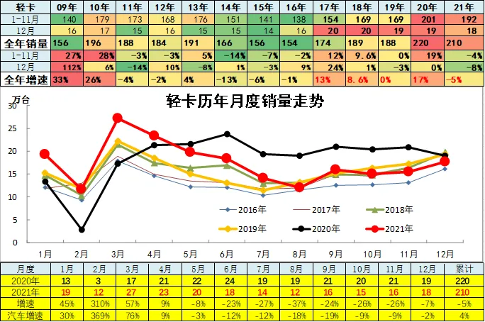 2021年上半年中国汽车市场呈现低基数高增长的恢复性增长走势,3季度卡车与乘用车全面严重低迷,4季度卡车市场持续回落,乘用车市场平稳回暖。2021年中国汽车市场相对2019年的走势总体稍好,2020年疫情后的V型反转走势逐步回归平稳常态,由于芯片缺损改善,12月汽车市场高增长特征明显,推动全年销量实现4%的正增长。