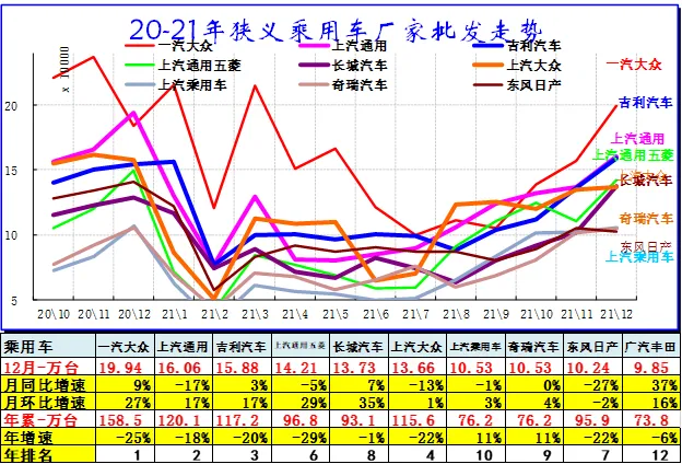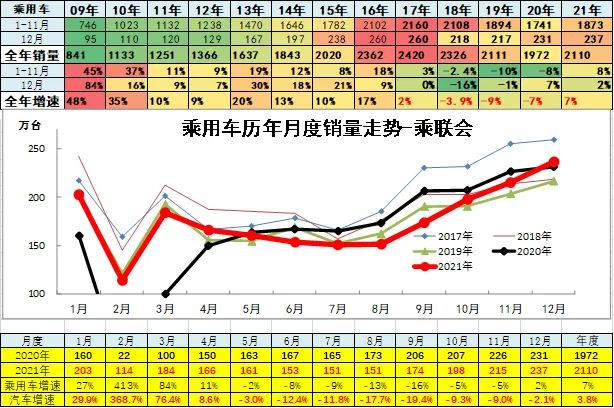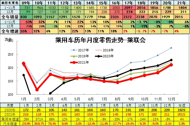 根据乘联会信息,2019年1-12月乘用车厂家批发销量增速-7%,是历年最低的,弱于汽车市场走势。乘联会统计2020年累狭义乘用车销量1929万台,累计增速-7%;2021年乘用车零售受到低基数促进而上半年暴增,下半年压力偏大,全年零售达到2015万台,增4%。