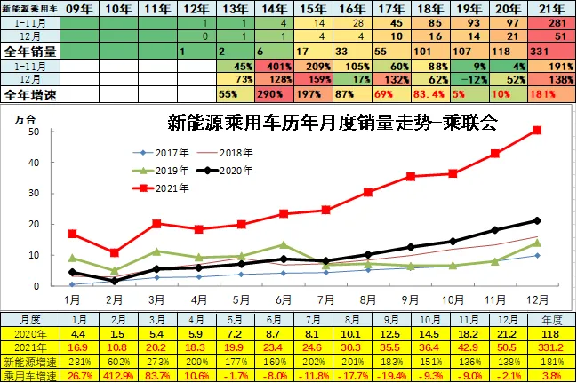 12月新能源乘用车市场总体走势超强,月度走势超强,增速目前在1.3倍的水平。新能源乘用车全年达到331万台,增长181%。新能源车与传统燃油车走势形成强烈差异化的特征,实现对燃油车市场的替代效应,并拉动车市加速向新能源化转型的步伐。