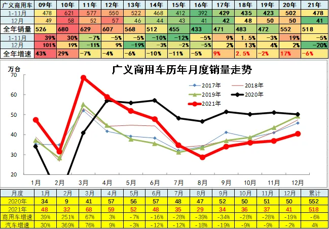 商用车市场总体走势较强,2020年1~12月份同比增长19%,呈现历年少有的淡季高增速特征。2021年的商用车市场起步超强,上半年暴增,下半年剧烈负增长,年累同比增速-6%,逐步低于车市总体走势。这也是透支未来的干扰因素。