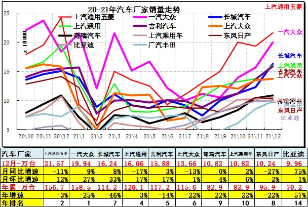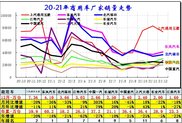 2020年的的五菱走势相对很强,东风恢复,2021年12月其它厂家分化。华晨鑫源、长安走势改善,微车其它企业走势压力仍较大。