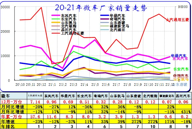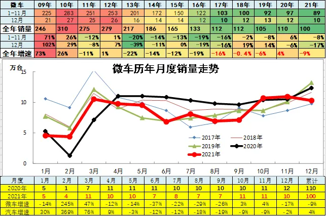 2021年累微型车销量99.57万台,累计增速-9.2%;12月微型车销量10.27万台,同比增长-17%,环比增长-6.1%。2021年累微客销量47.13万台,累计增速21.5%;12月销量6.14万台,同比增长31.4%,环比增长-12.6%。