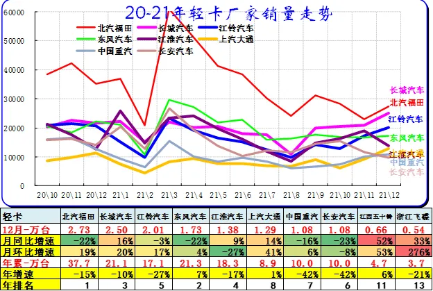 2021年的轻卡主力厂家分化较明显,福田和东风走势超强,江铃、江淮的轻卡表现平稳。主力车企的福田保持超强的龙头地位。长城的轻卡走势很强,主要也是长城皮卡走势很好。