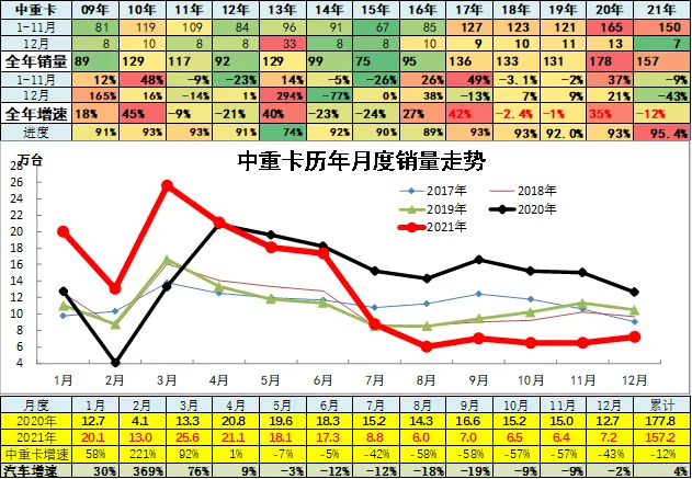 2019年全年累计中重卡销量131.36万台,累计增速-0.9%;2020年累中重卡销量177.8万台,累计增速35%;2021年累中重卡销量163.7万台,累计增速-7.9%;12月销量7.23万台,同比增长-43%,环比增长12.4%。
