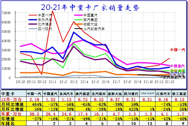 2021年1-12月的主力走势分化,一汽重卡12月走势零售仍是领军,全年突破30万。但东风相对平稳。潍柴系的重汽走强和陕汽平稳回落。福田扩大与重汽的差距。