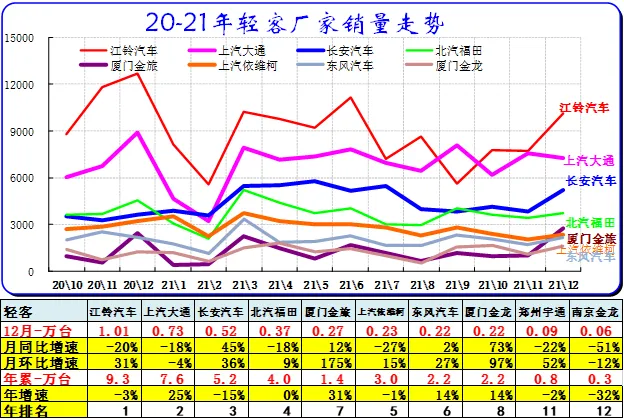 2021年累轻客销量41.16万台,累计增速19.6%;12月销量3.87万台,同比增长-14.2%,环比增长22.7%。轻客企业的走势相对平稳,近期波动不大。由于轻客新能源的突破速度较慢,专用车的走势也不是很强,因此轻客的市场压力仍大。