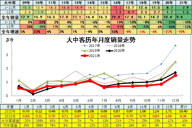 2020年累大中客销量10.4万台,累计增速-27%;2021年累大中客销量9.36万台,累计增速-10%;12月销量1.5万台,同比增长-12%,环比增长78.3%。前两年大中客表现较强,同比增长出现高增长,增长主要是因为新能源公交车的抢补贴行情,同时也是地方政府推动的结果。2021年疫情影响逐步消退,因此大中型客车有恢复的机会,但目前地方政府缺钱,补贴类车型表现一般。