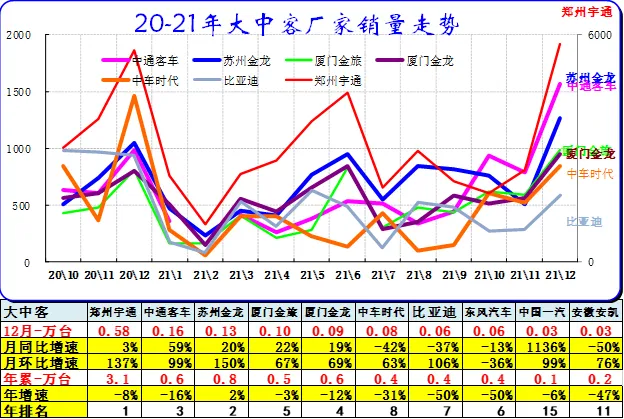 2020年1-12月的比亚迪客车表现很好。12月的传统车企的厦门金龙和苏州金龙表现较强,新能源客车尚未有效启动。