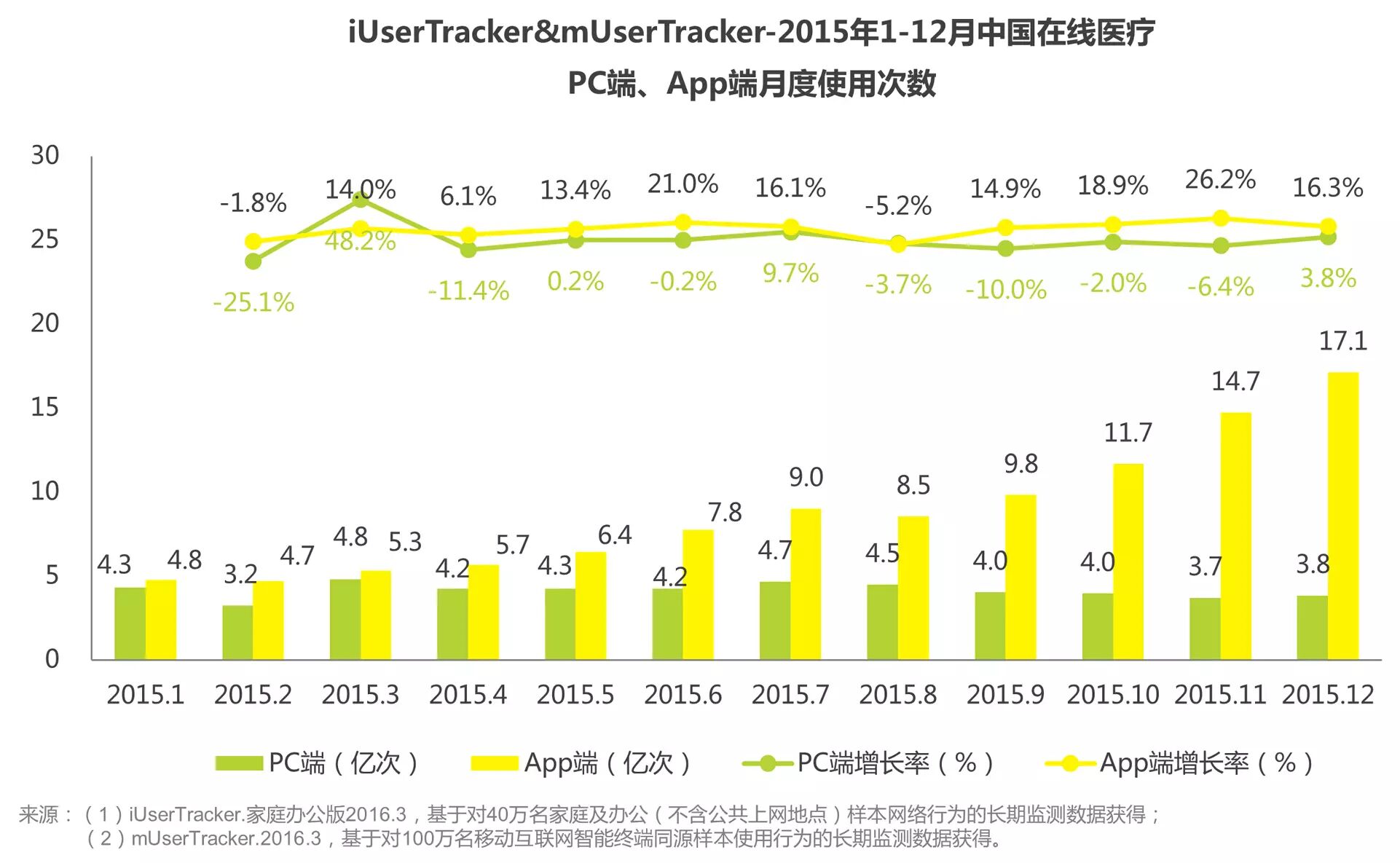 艾瑞iUserTracker和mUserTracker监测数据显示,2015年1至12月在线医疗行业App端月度使用次数逐月上升,12月更是增长至17.1亿次,而PC端则保持在4亿次左右,App端同PC端差距逐步拉大。