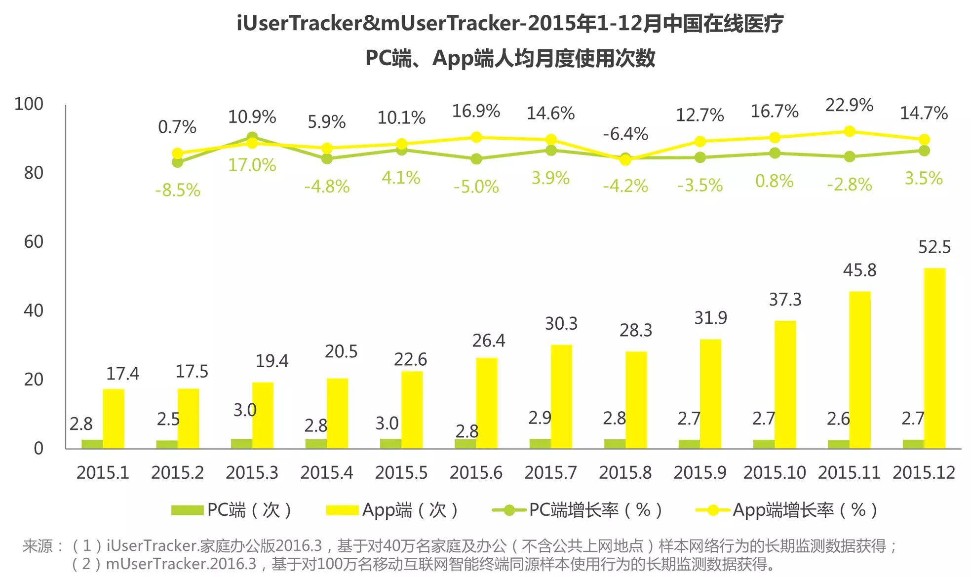 艾瑞iUserTracker和mUserTracker监测数据显示,2015年1至12月在线医疗行业App端人均月度使用次数逐月上升,12月增长至52.5次,而PC端人均月度使用次数则在3次左右波动,App端人均月度使用次数明显高于PC端,且逐渐同PC端形成巨大差距。