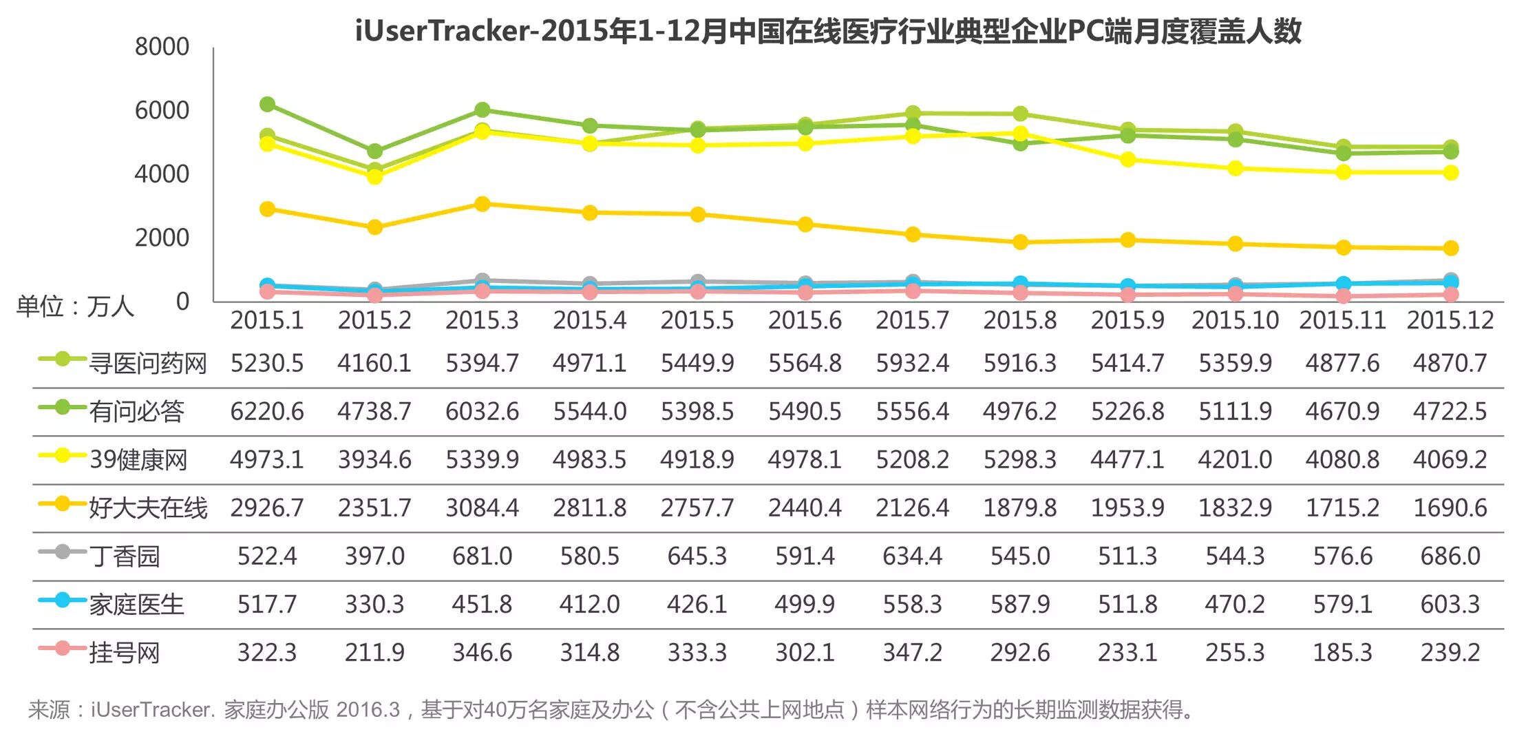 艾瑞iUserTracker监测数据显示,2015年1-12月在线医疗行业典型企业PC端月度覆盖人数普遍在2月份出现下滑,3月份之后趋于稳定。寻医问药网、有问必答和39健康网处于行业的领先地位,月度覆盖人数均维持在4000万人以上。好大夫在线为第二梯队,丁香园、家庭医生和挂号网为第三梯队。