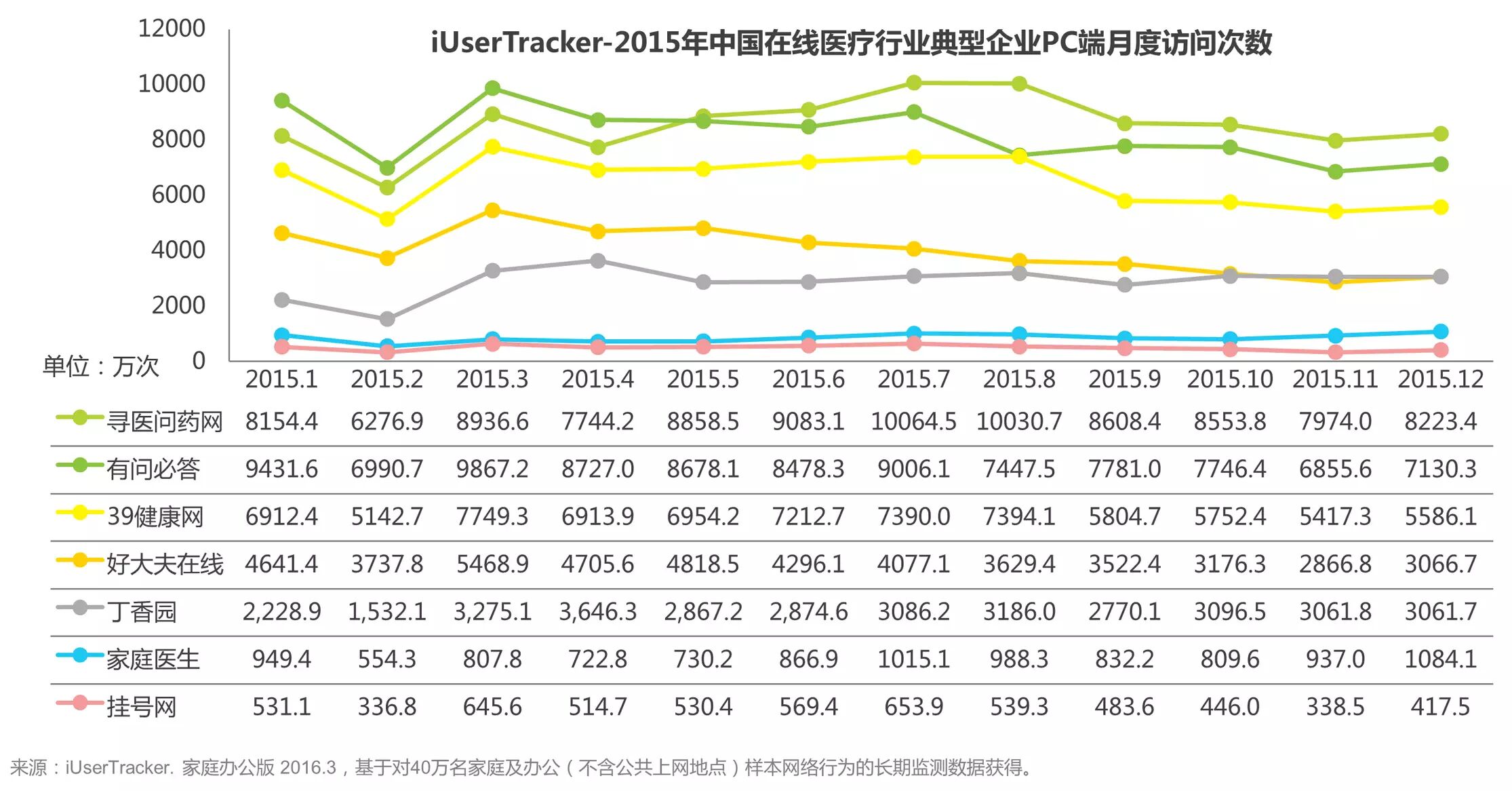 艾瑞iUserTracker监测数据显示,2015年1-12月在线医疗行业典型企业PC端月度总访问次数与月度覆盖人数变化趋势一致,普遍在2月份出现下滑,3月份之后趋于稳定。寻医问药网、有问必答和39健康网处于行业的领先地位,月度总访问次数均维持在5000万次以上。