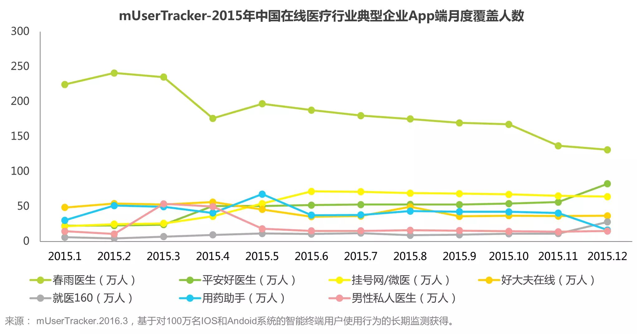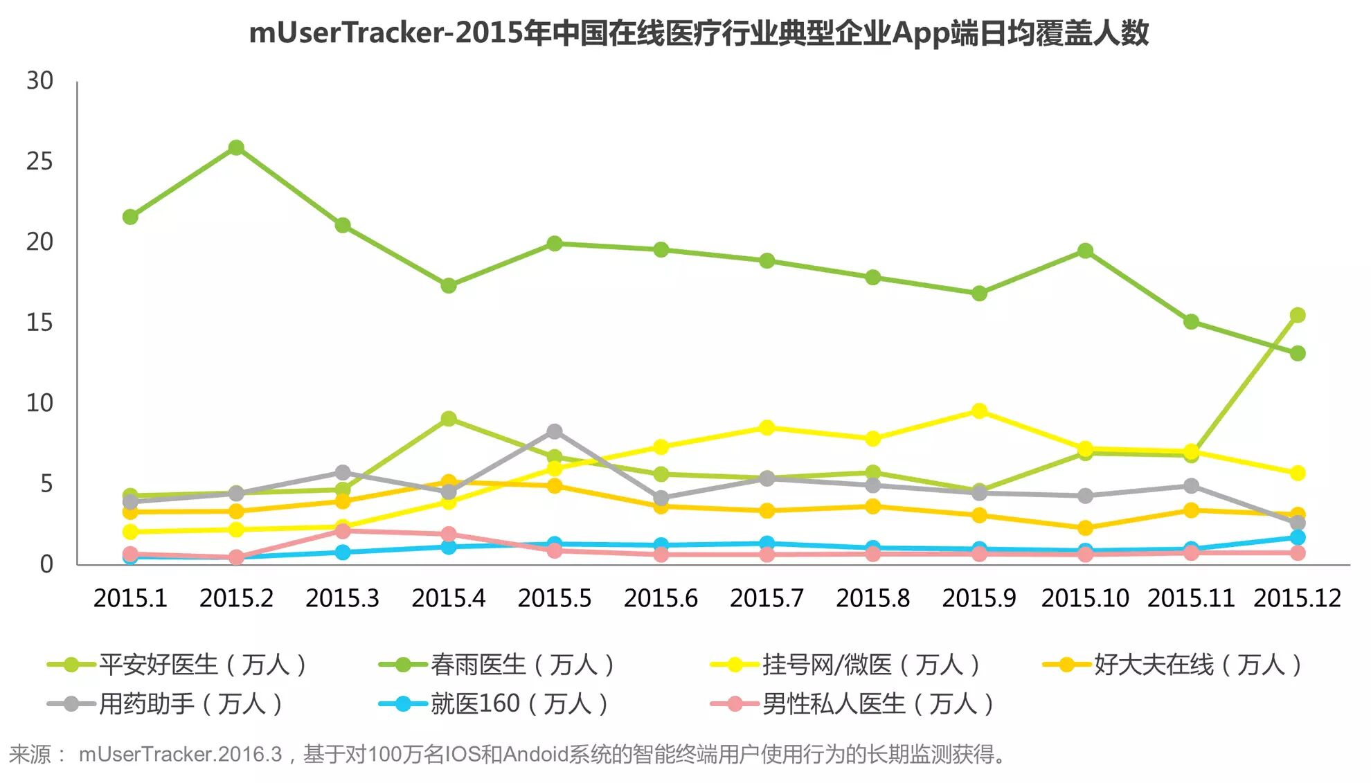 艾瑞iUserTracker监测数据显示,除健康保健类,2015年1-11月春雨医生App端日均覆盖人数处于领先地位;平安好医生增长迅速,在12月日均覆盖人数超越春雨医生。