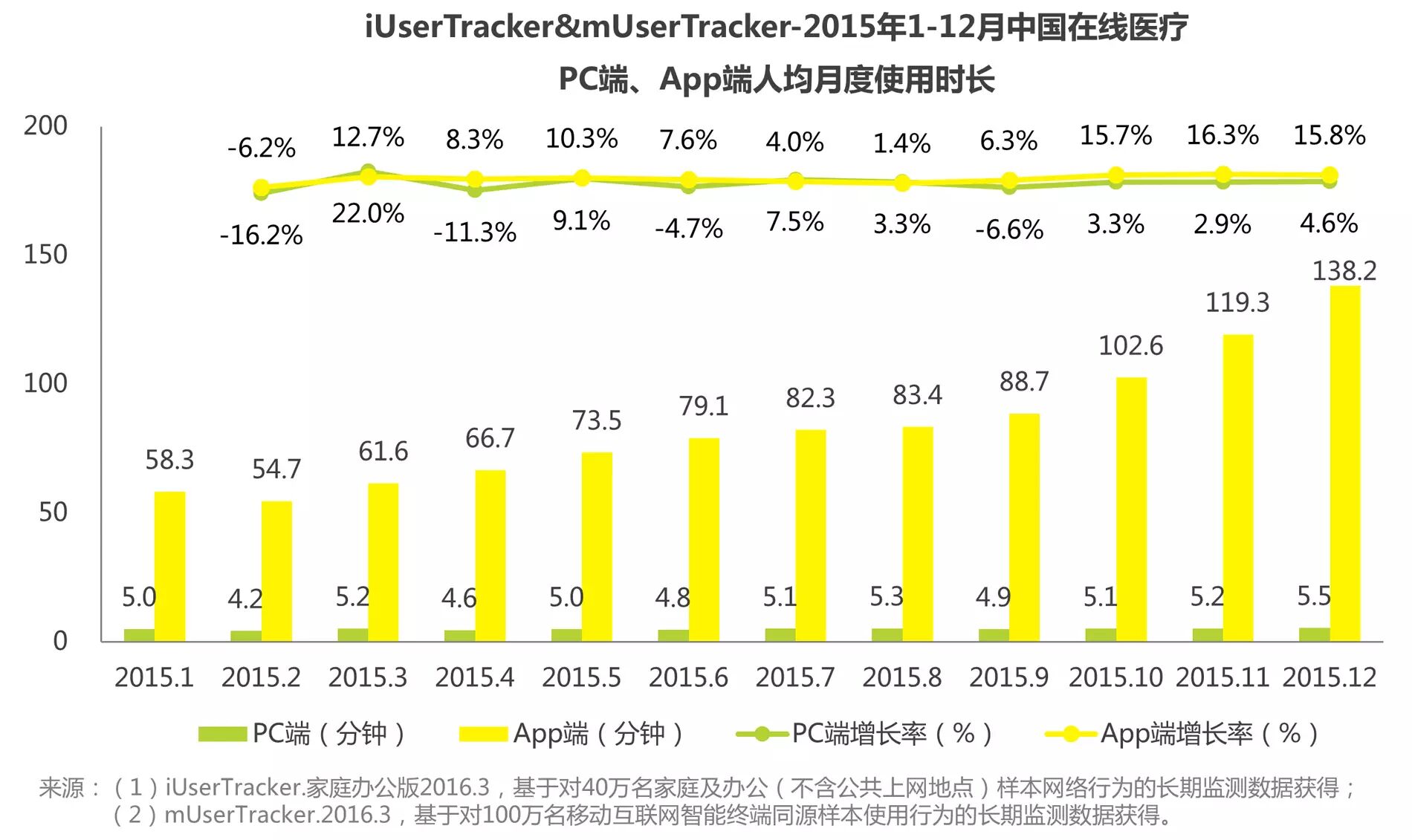 艾瑞iUserTracker和mUserTracker监测数据显示,2015年1至12月在线医疗行业App端人均月度使用时长逐月上升,12月增长至138.2分钟,而PC端人均月度使用时长则在5分钟左右波动,App端人均月度使用时长远远高于PC端,且逐渐同PC端形成巨大差距。