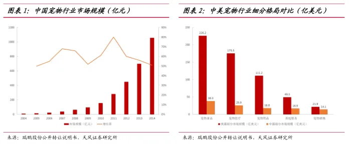 2014年中国宠物行业市场规模为1058亿元,其中宠物医疗市场规模~150亿元,行业增速~30%,是伴随居民生活水平提高而产生的朝阳行业。