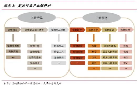 宠物行业相关的产品和服务主要包括医疗保健、宠物美容、宠物食品、用品用具等相关产品,产业链上游主要是宠物食品,产业链下游主要是宠物医疗。我国目前初步形成了宠物行业产业链,行业发展迅速,产业链逐步丰富和延伸。