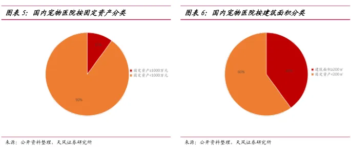 国内宠物医院数量超过10000家,按固定资产划分,固定资产在1000万元以下的医院占90%,固定资产在1000万元以上的医院占比10%。按照医院面积划分,具有一定规模的医院面积约为200-300平方米,数量不足4000家。