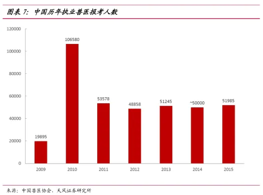 2008年我国修订实施了《动物免疫法》,第一次以法律的形式确定了执业兽医资格考试制度。截至2015年,已经取得执业资格的76,868位执业兽医中,执业兽医师资格39,808人,执业助理兽医师资格37,060人。每年我国报名人数约为5万人,年通过率仅10%左右。