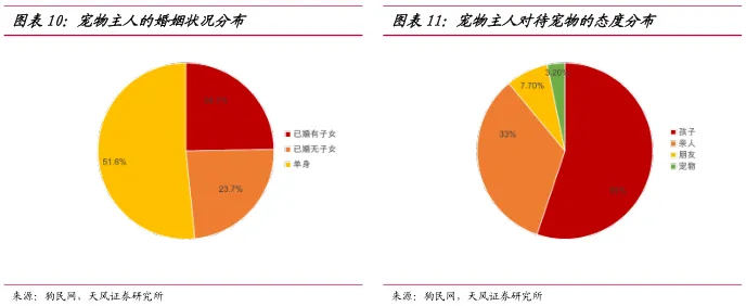 宠物扮演重要的陪伴角色。在单身和已婚无子女者所占比例超过80%,超过50%的宠物主人将宠物视为孩子,只有3.2%的宠物主人只是将宠物当作娱乐工具。宠物主人的情感寄托增强了他们的支付意愿,提升了宠物消费水平。