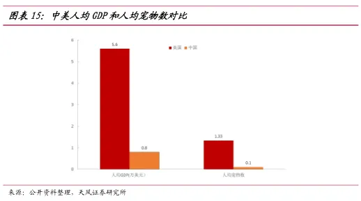 2015年我国居民人均GDP为5.2万元,约合8016美元。宠物行业在一线城市宠物行业发展迅速,而二三线城市仍有巨大的潜力可以挖掘。养宠人群呈现年轻化态势,“80后”和“90后”成为养宠主力,同时人口老龄化趋势导致了生活方式和家庭结构的改变,养宠开始由娱乐向情感需求,消费者支付意愿的提升。