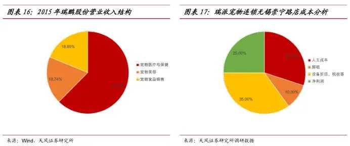 宠物医院主要的盈利来自于诊疗服务收费。以瑞鹏股份为例,2015年公司完成宠物接诊量超过25万例,常见医疗保健服务包括外科疾病的一般处理和手术、内科疾病的诊治、皮肤病防治、传染病防治和宠物免疫及驱虫。2015年宠物医疗与保健营业收入为8,866万元,占营业总收入的62.41%,宠物美容及宠物的食品用品销售分别占比18.74%和18.85%。